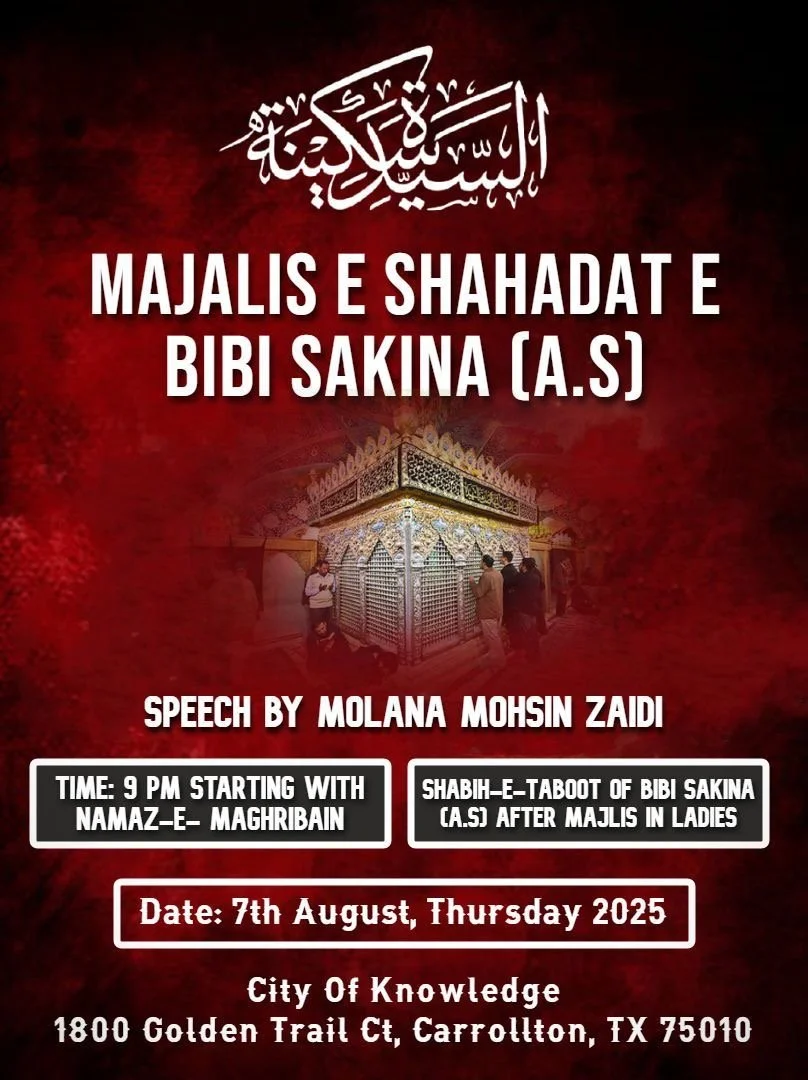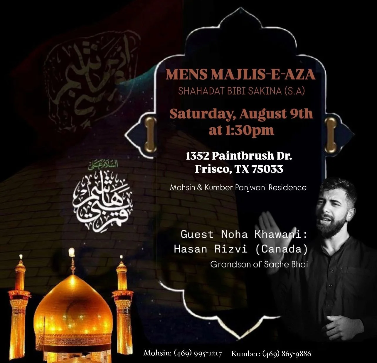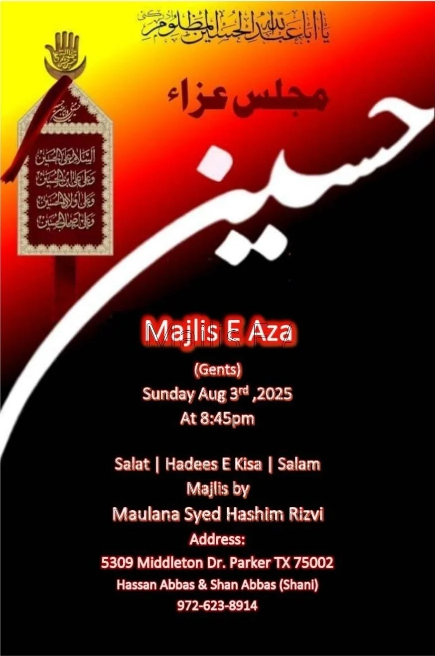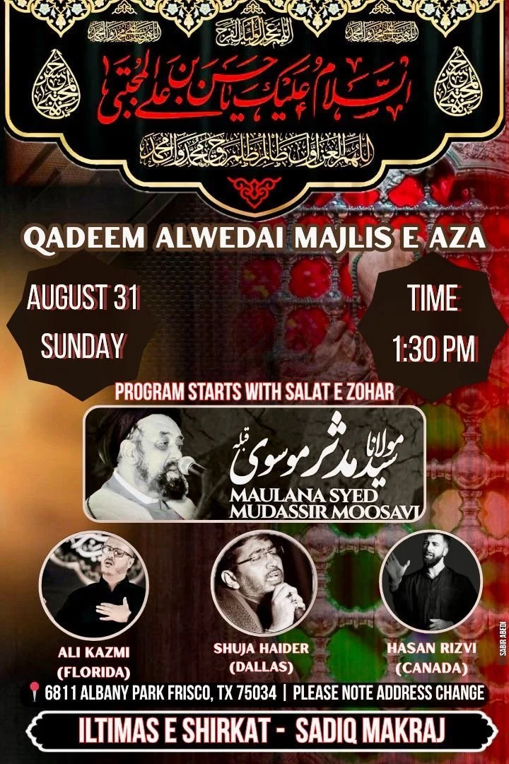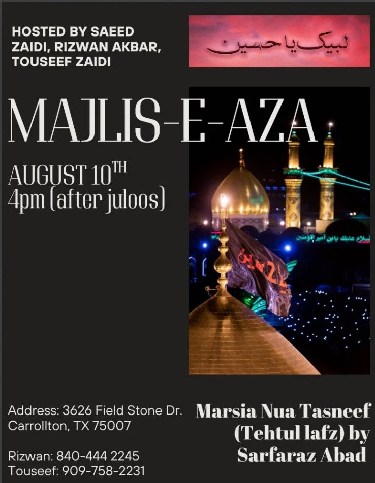 Dallas Renowned Reciter Br Shuja Zaidi will recite Salaam and Noha on Friday 22nd August, followed by Shabi-e-Taboot.