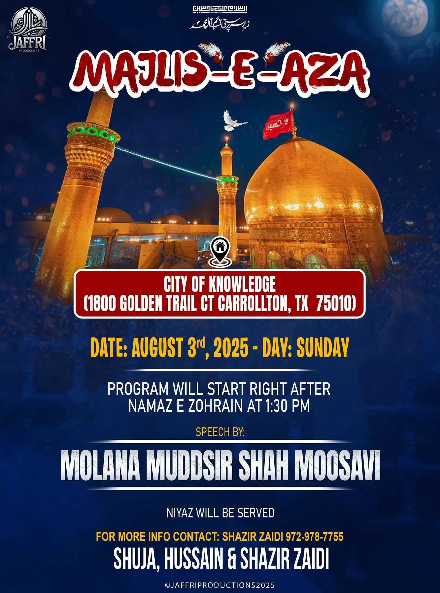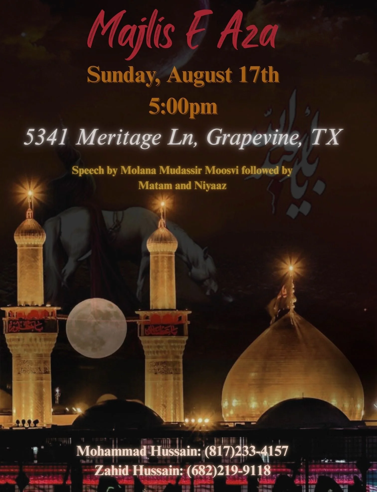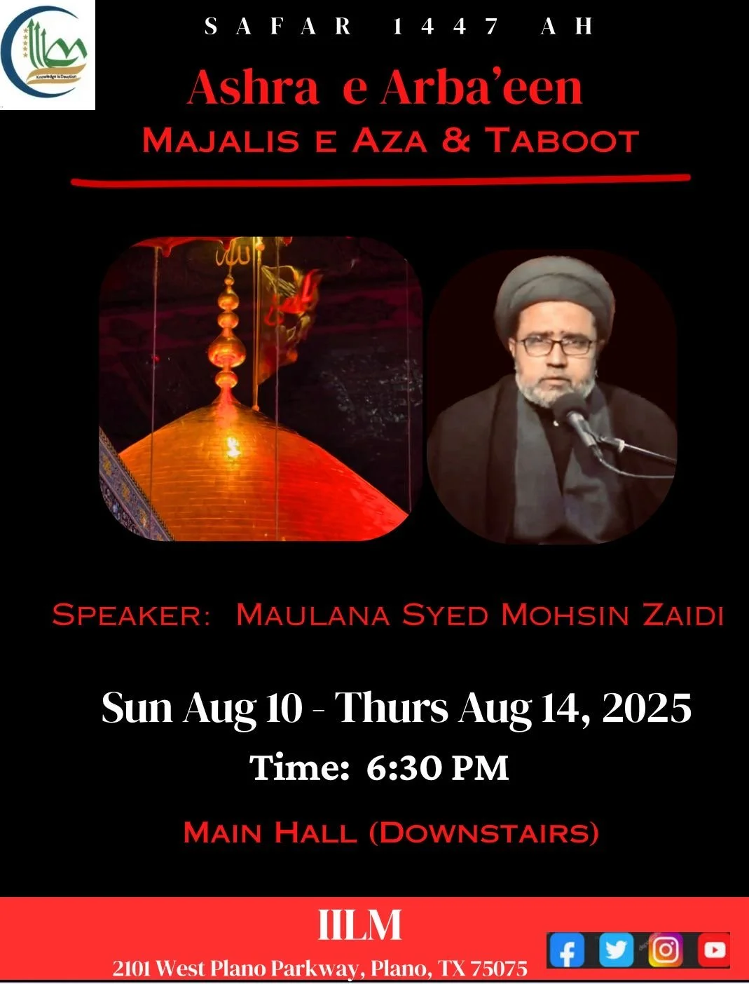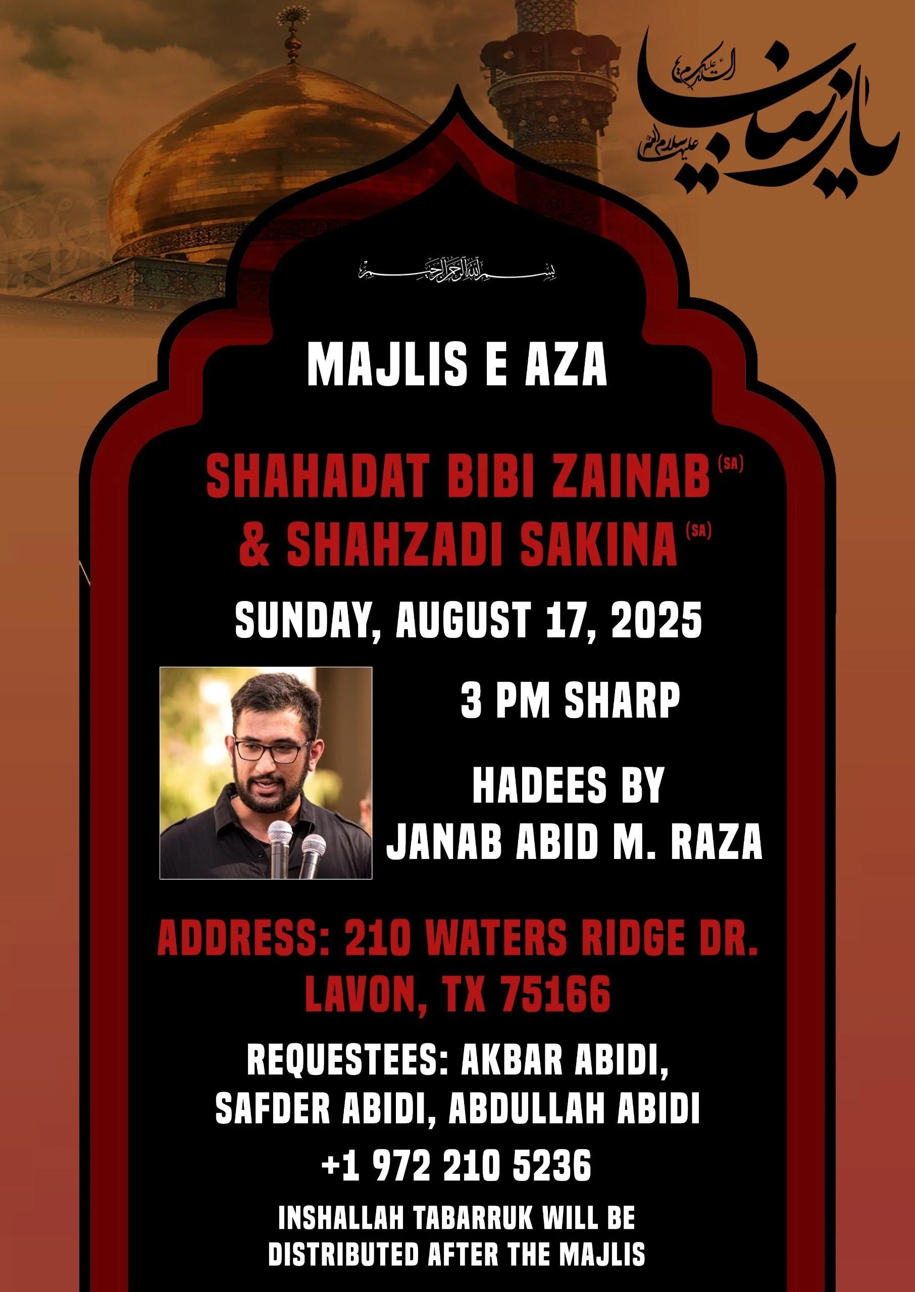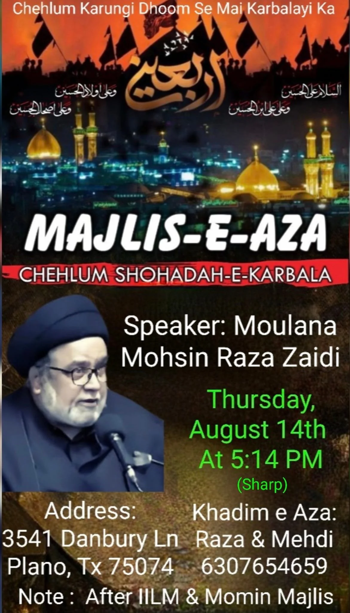 Dallas Renowned Reciter Br Shuja Zaidi will recite Salaam and Noha on Friday 22nd August, followed by Shabi-e-Taboot.