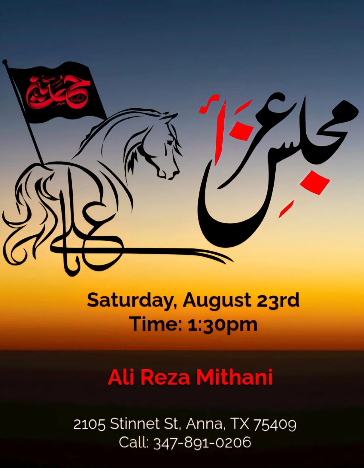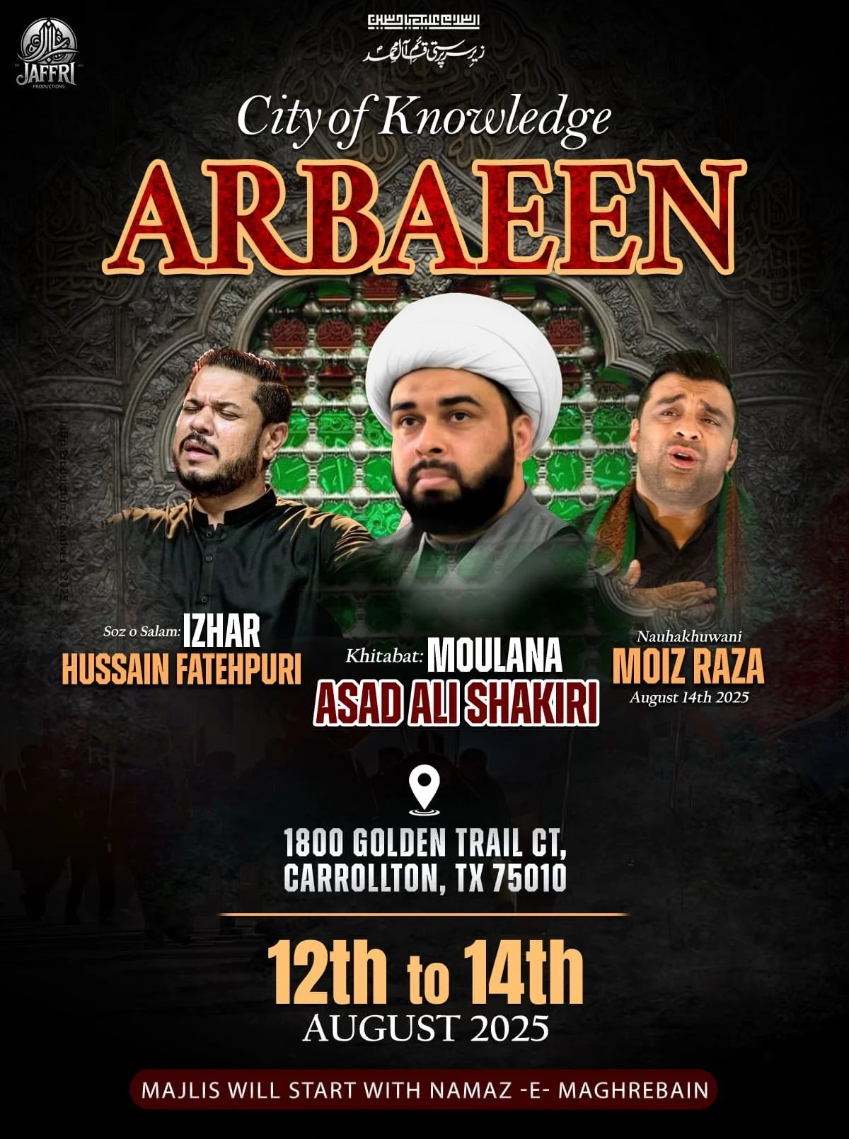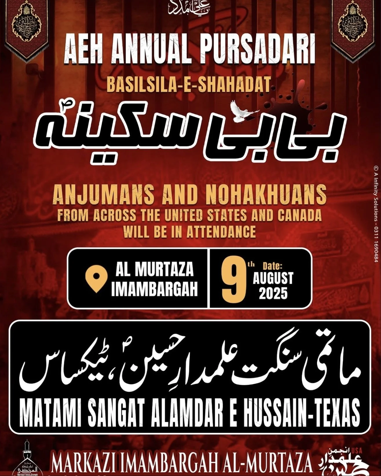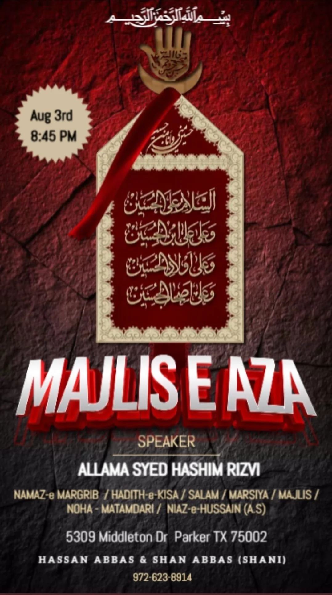 Dallas Renowned Reciter Br Shuja Zaidi will recite Salaam and Noha on Friday 22nd August, followed by Shabi-e-Taboot.