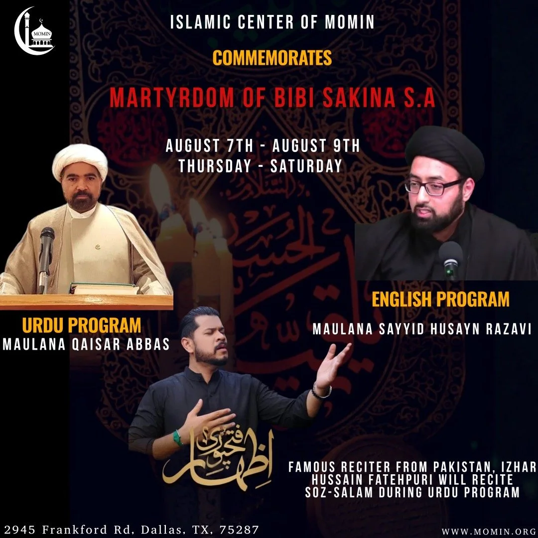 We are blessed to have Maulana Syed Raza Mehdi Naqvi from Chicago,IL for English majlis & Maulana Shahid Hussain from India for Urdu Majlis at MOMIN Center.