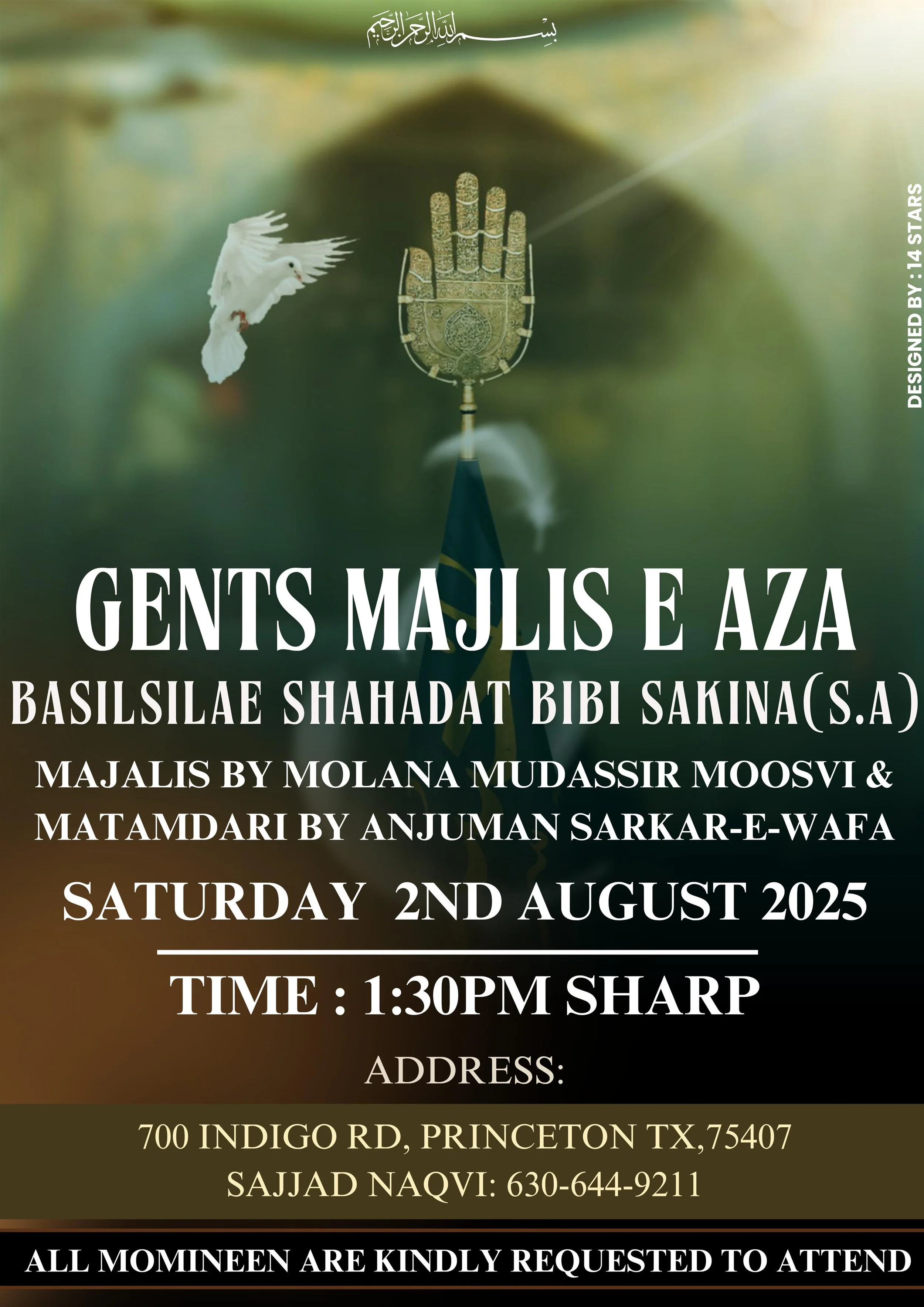Majalis e Aza at Sajjad Naqvi’s Residence at 1:30 PM Saturday, August 2, 2025 1:30 PM 3:00 PM 13:30 15:00 700 Indigo Road Princeton, TX, 75407 United States (map) Google Calendar ICS Apple Maps LinkMolana Mudassir Shah Moosvi will recite majalis For Information and Directions please call Sajjad Naqvi at (630) 644-9211