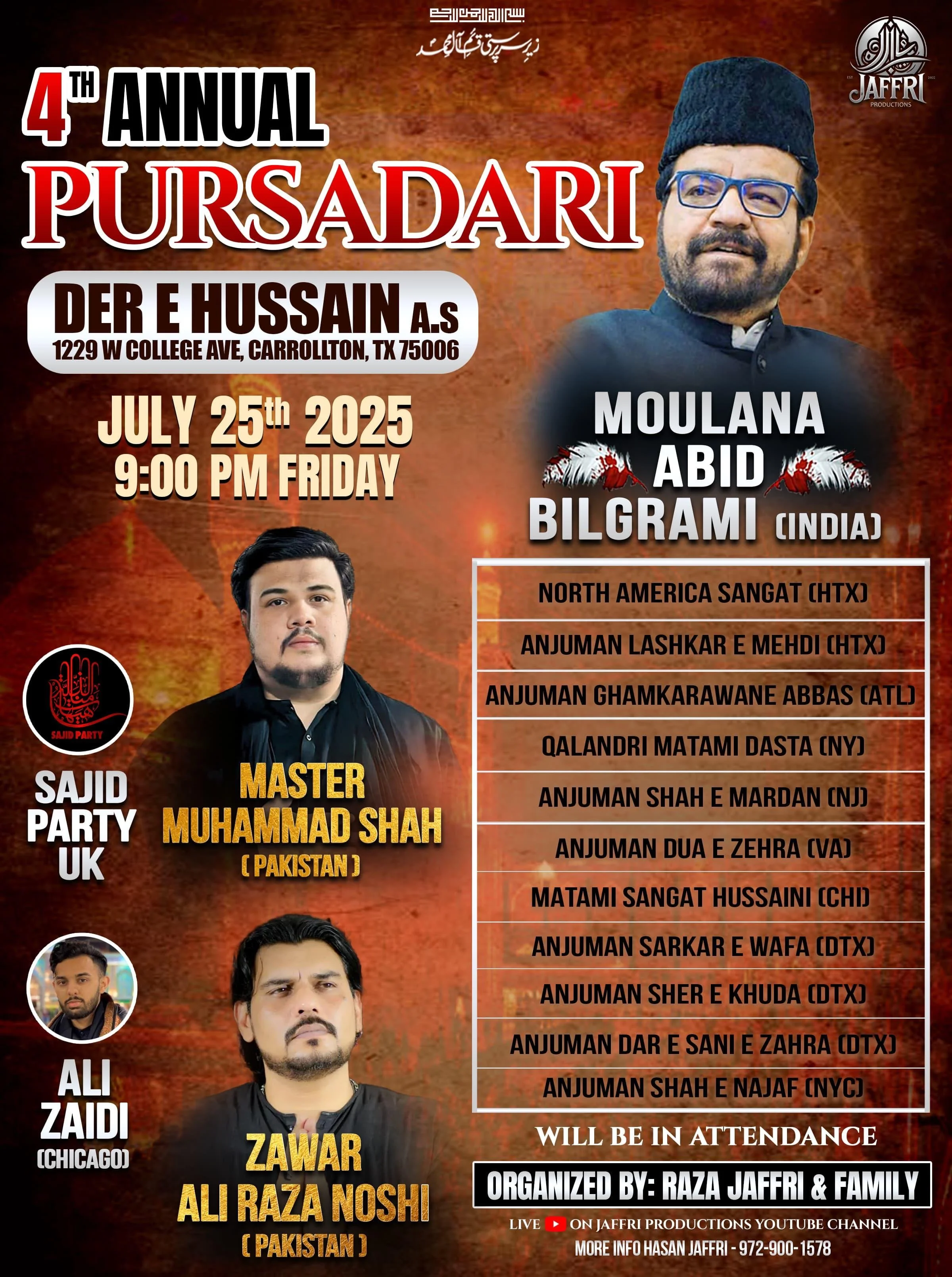 Pursadari at Dar e Hussain Hosted by Raza & Hasan Jafri at 9 PM Friday, July 25, 2025 9:00 PM 11:30 PM 21:00 23:30 1229 West College Avenue Carrollton, TX, 75006 United States (map) Google Calendar ICS Apple Maps LinkThe program will start with Magrib NamazFor Information and Directions please call Hasan Jafri at (972) 900-1578