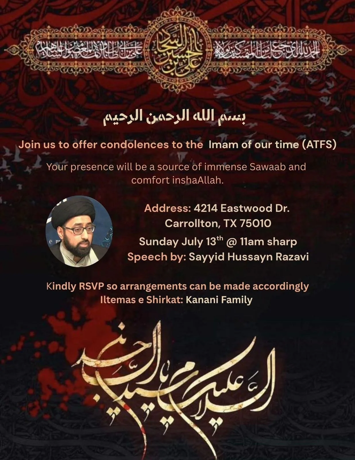 Majalis e Aza at Sadiq & Hassan Kanani’s Residence at 11 AM Sunday, July 13, 2025 11:00 AM 1:30 PM 11:00 13:30 4214 Eastwood Drive Carrollton, TX, 75010 United States (map) Google Calendar ICS Apple Maps LinkMolana Sayyid Husayn Razavi will reciteFor Information and Directions please call Hassan Kanani at (469) 531-4791